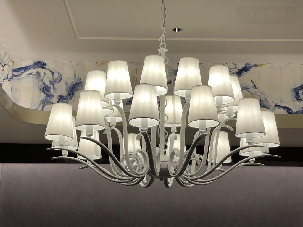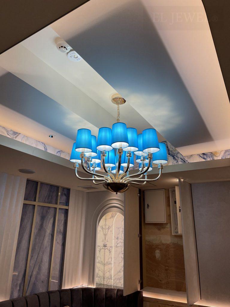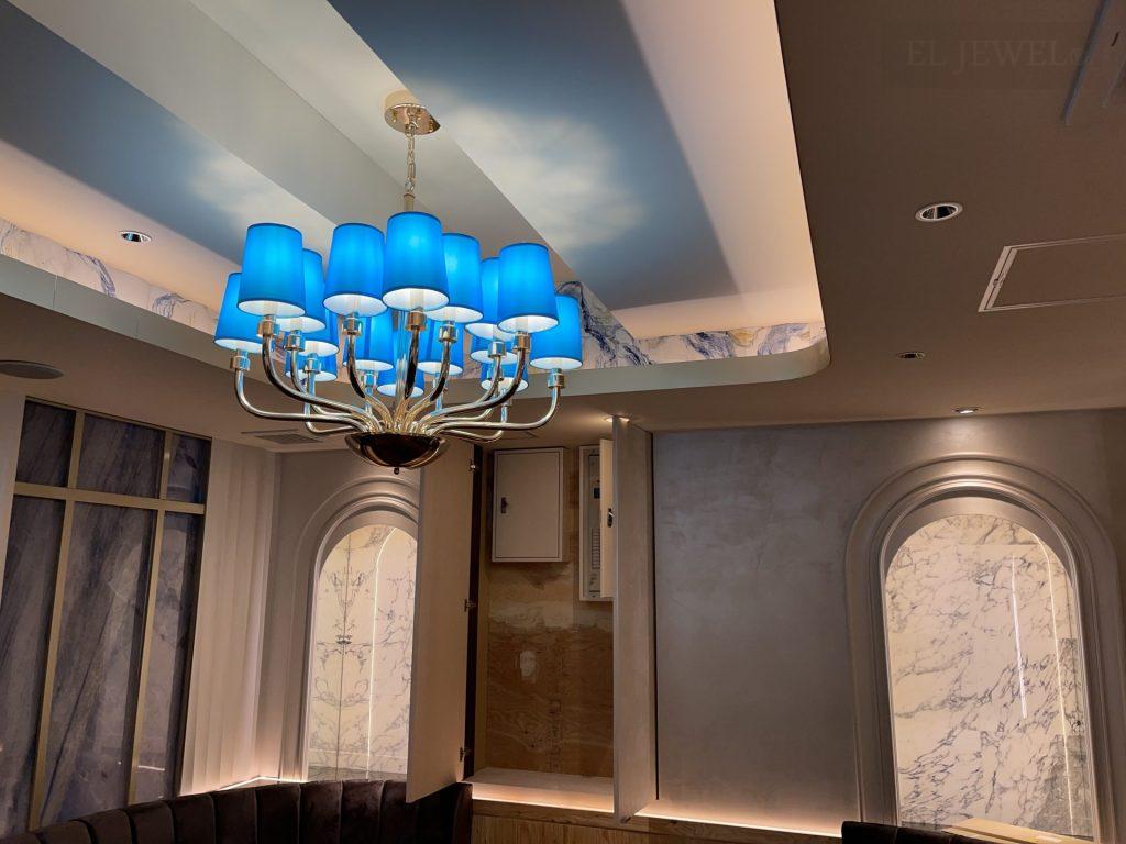 今回特注したシャンデリアは、鮮やかなブルーのシェードが特徴で、店舗の内装に映える一品となりました。それはまるで深海の光を捉え、その美しさを店舗の天井から放つかのよう。あなただけの特別なシャンデリアが、お店の雰囲気を一層引き立てます。