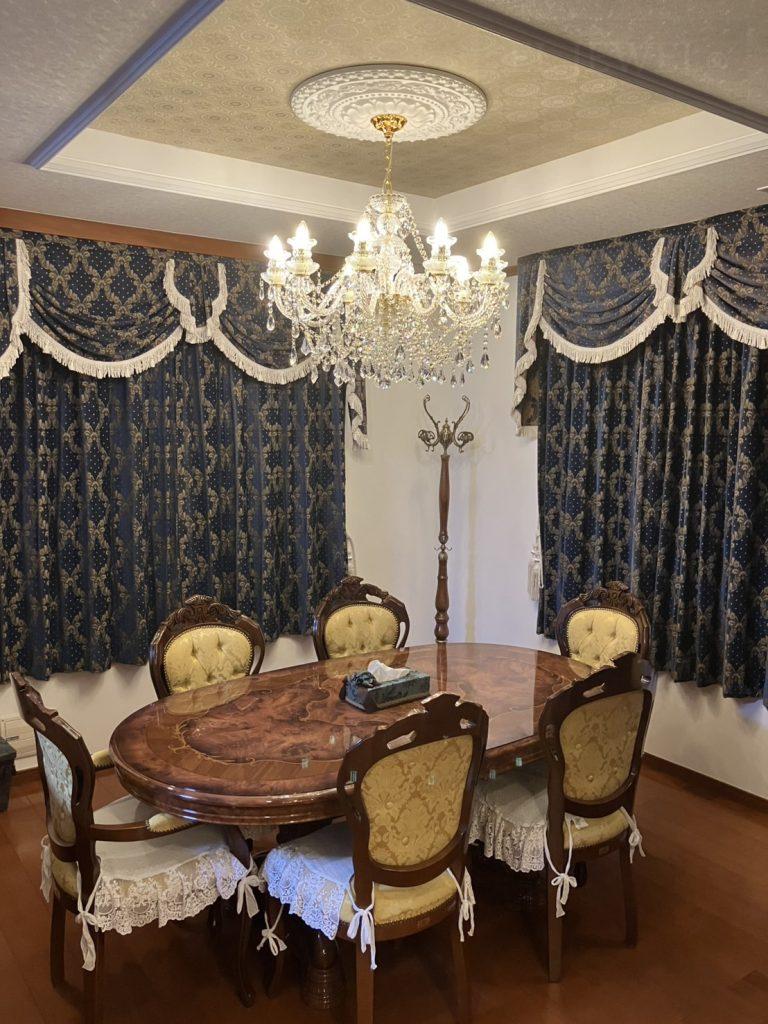 大きな吹き抜け空間を優雅に照らすのは、当社が設計・製造したオリジナルの24灯クリスタルシャンデリア。高さのある天井と、クラシックなソファセットが引き立て合い、まるで海外の邸宅のような空気感に。