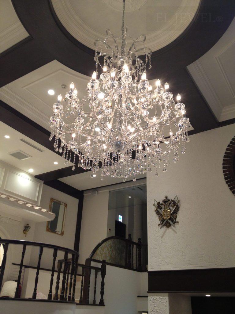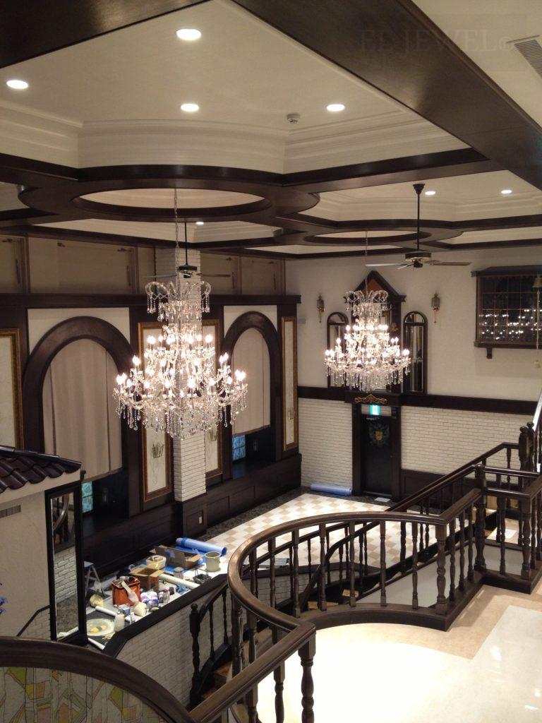 新潟県長岡市にあるレストランウエディング施設「英国屋」様では、クラシックな雰囲気を大切にした空間づくりを目指しておられました。私たちは、そのコンセプトに合わせて、大型のクリスタルシャンデリアを提案・納品いたしました。