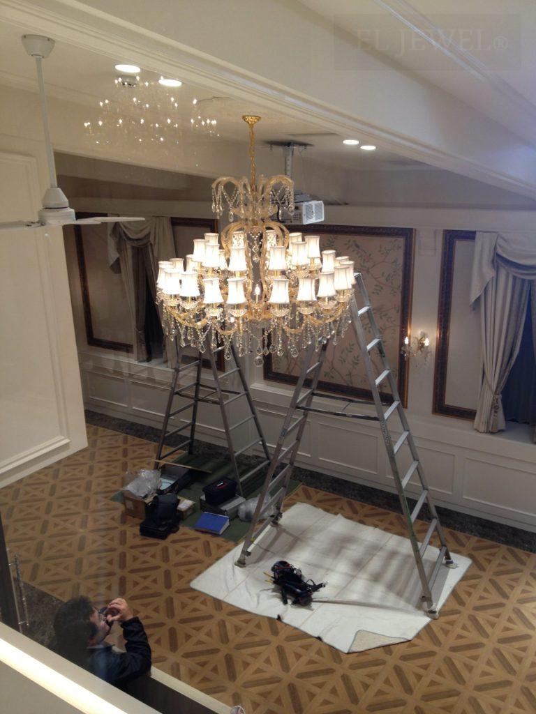 大型のシャンデリアは、重量やサイズの関係で、取り付けには専門的な知識と技術が必要です。私たちは、20年以上の経験を活かし、安全かつ確実な取り付けを行っております。また、現地での組み立てや、もしものための地震対策など、必要に応じた対応も可能です。